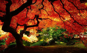 An Autumnal Wonderland Of Vibrant Hues, Glimmering Amongst Lush Green Trees Wallpaper -