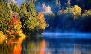A Beautiful Lake Surrounded By A Luscious Forest In Autumn. Wallpaper -