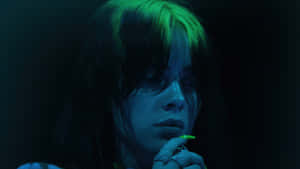 Billie Eilish Confidently Turns On Her Laptop, Ready To Create Her Unique Style Of Music. Wallpaper -