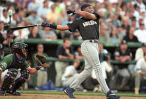 Legendary Baseball Player Ken Griffey Jr Is Pictured Swinging A Bat. Wallpaper -