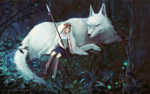 Princess Mononoke In The Forest With White Wolves Wallpaper -