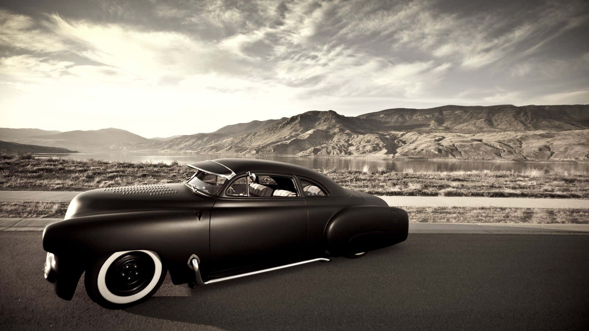 A Black Muscle Car Parked In The Desert Wallpaper -