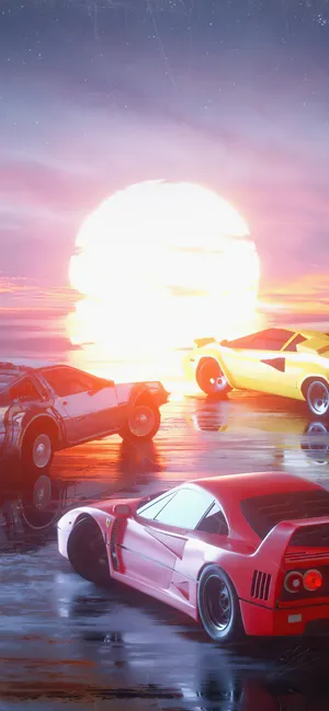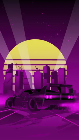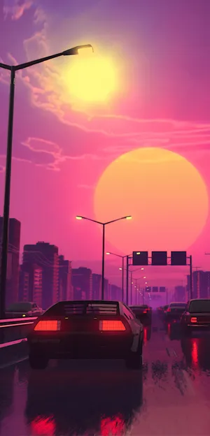 A Car Driving In The City At Night With A Neon Sunset Wallpaper -