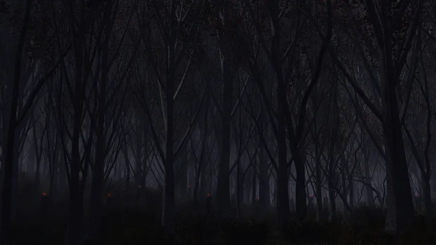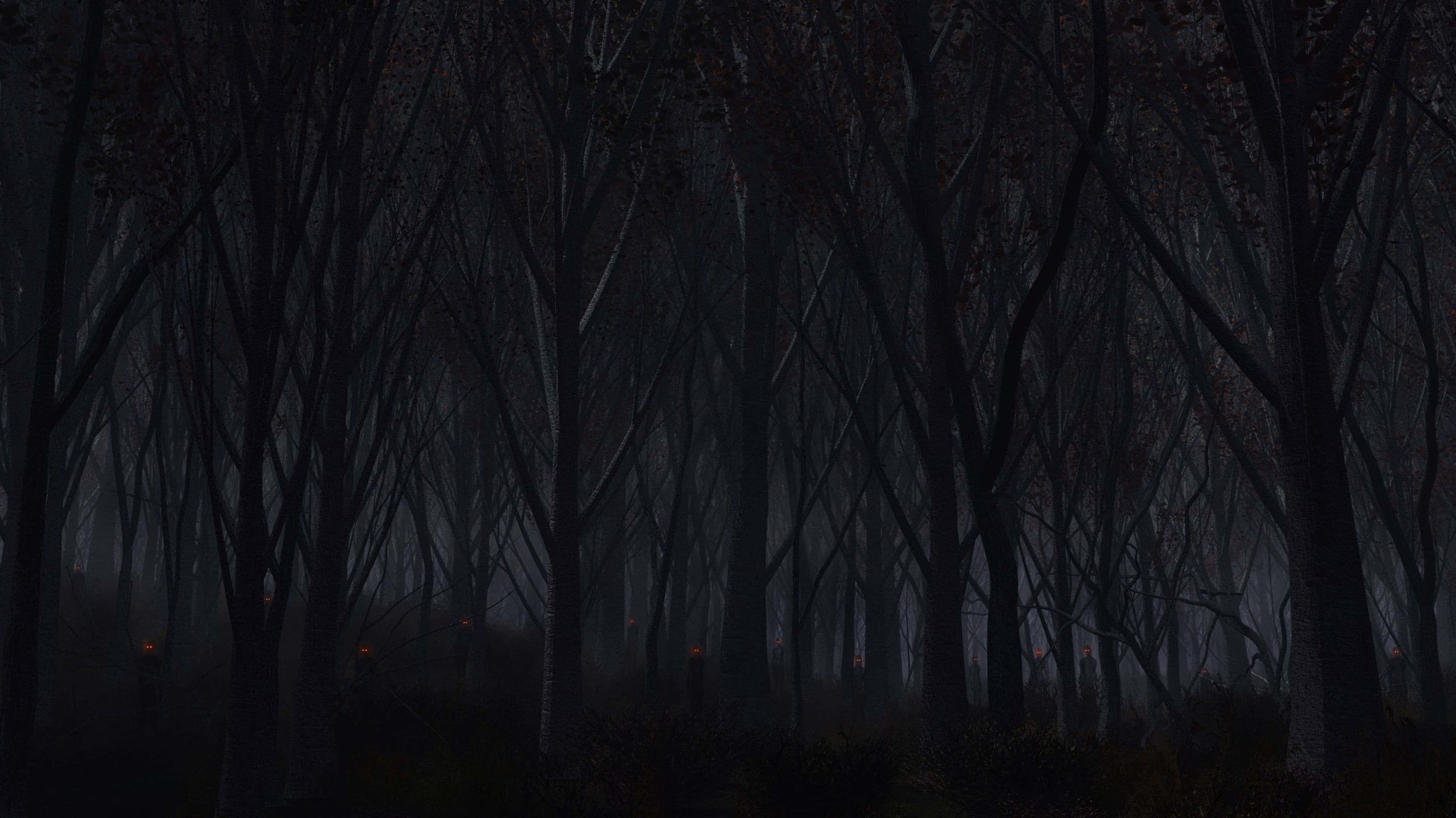 A Dark Forest With Trees And A Lamp Wallpaper