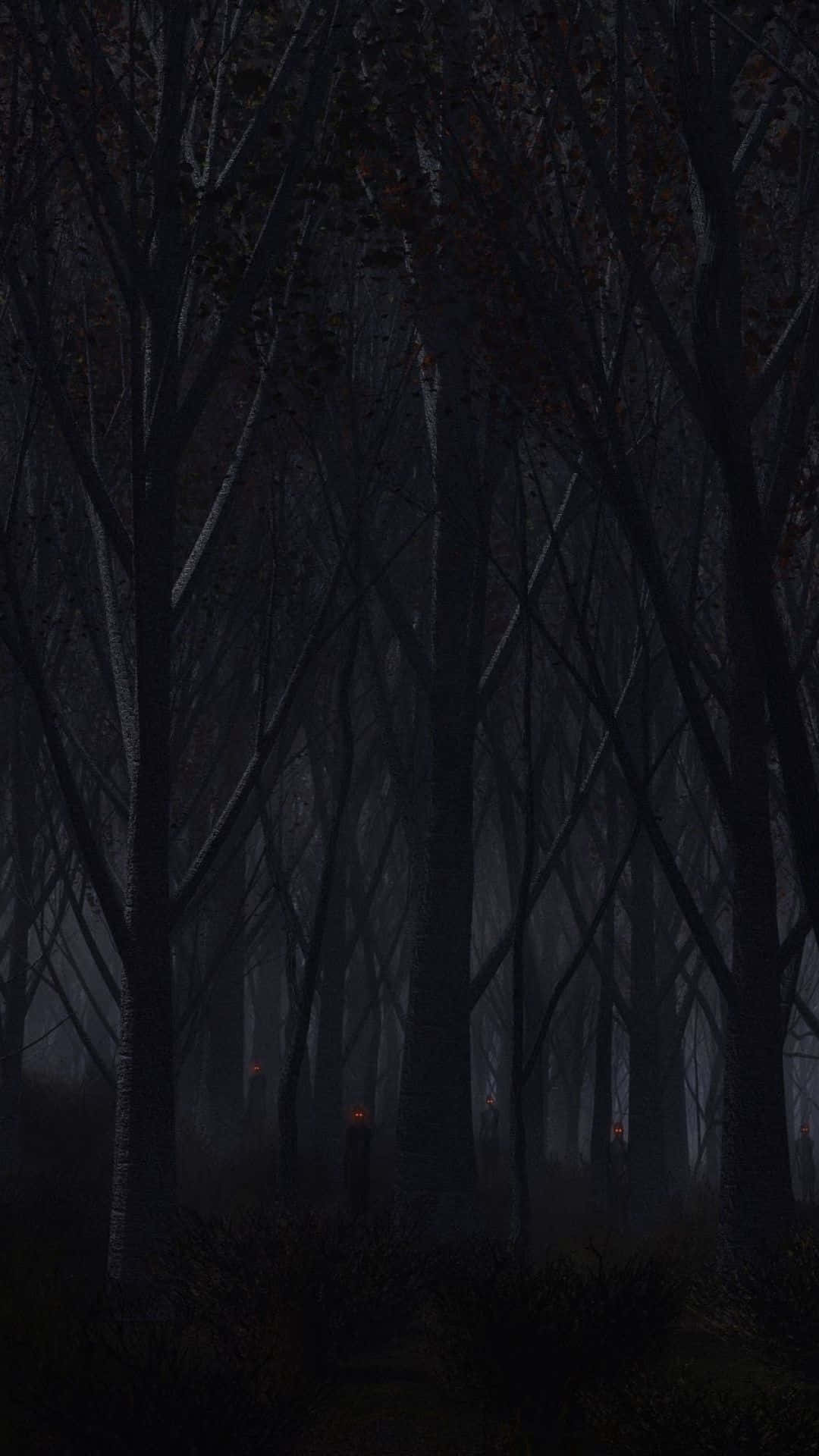 A Dark Forest With Trees And A Lamp Wallpaper