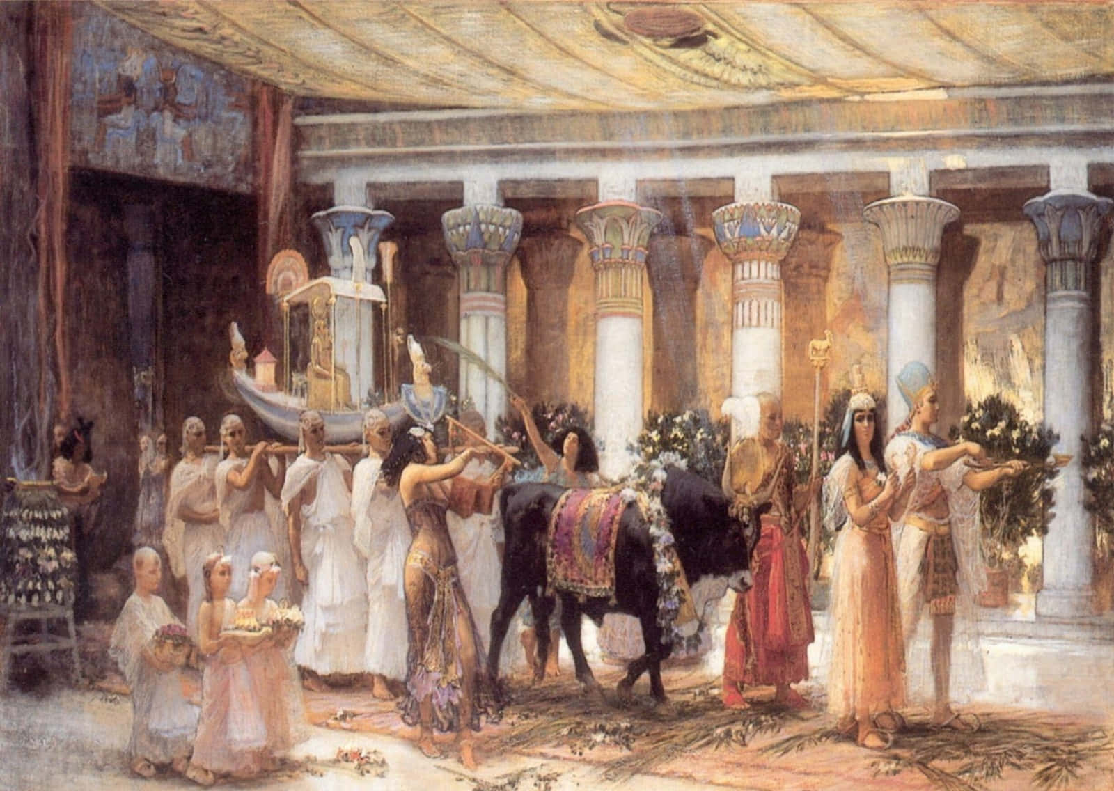 A Painting Of An Egyptian Temple With People In It Wallpaper -