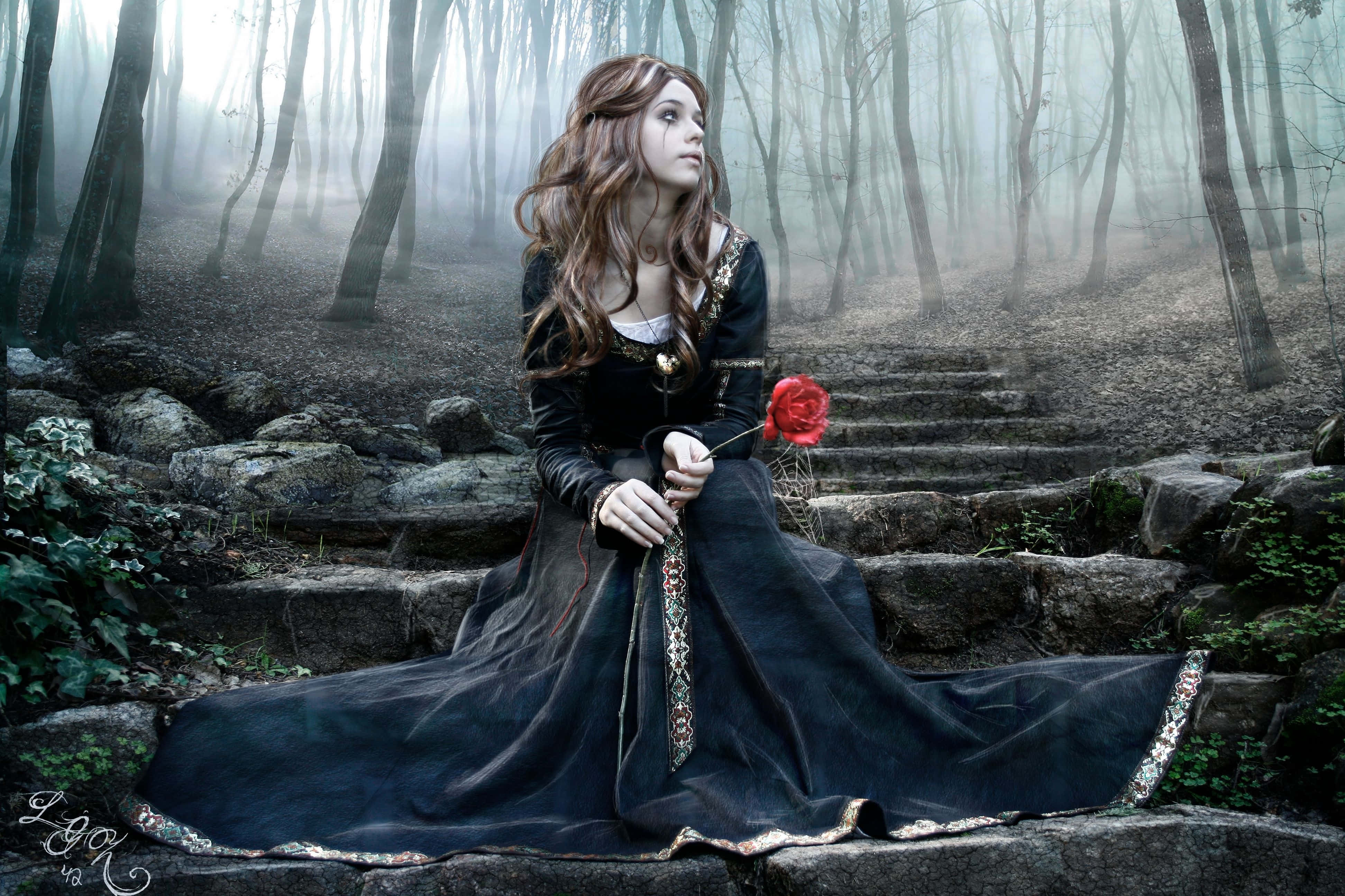 A Girl In A Black Dress Sitting On Steps In The Woods Wallpaper