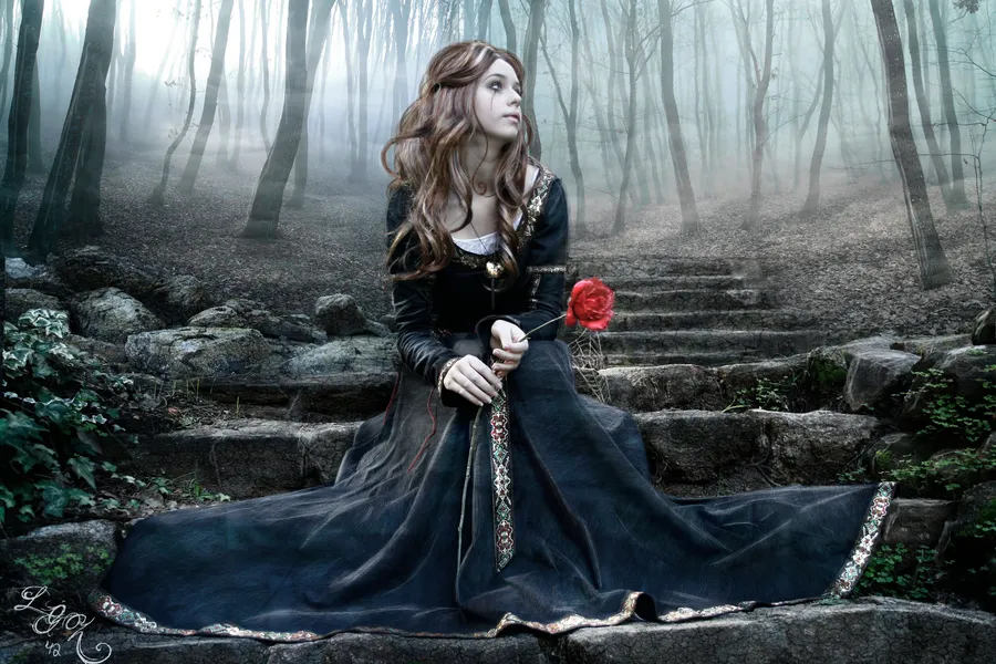 A Girl In A Black Dress Sitting On Steps In The Woods -