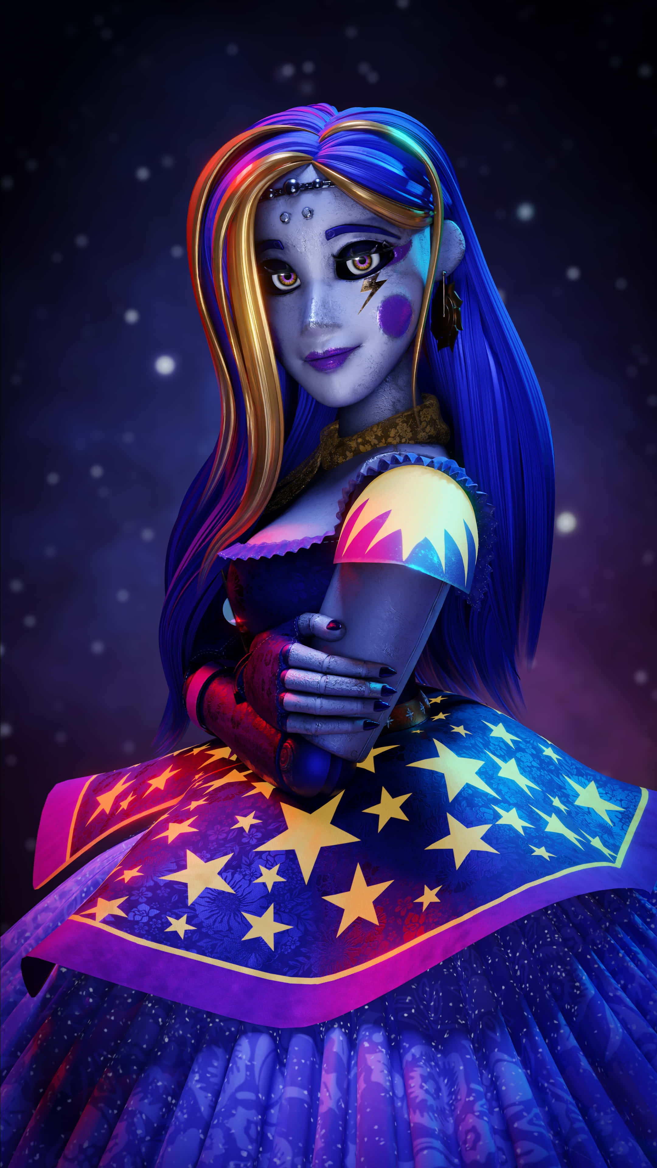 A Girl With Blue Hair And Blue Eyes Is Wearing A Dress -