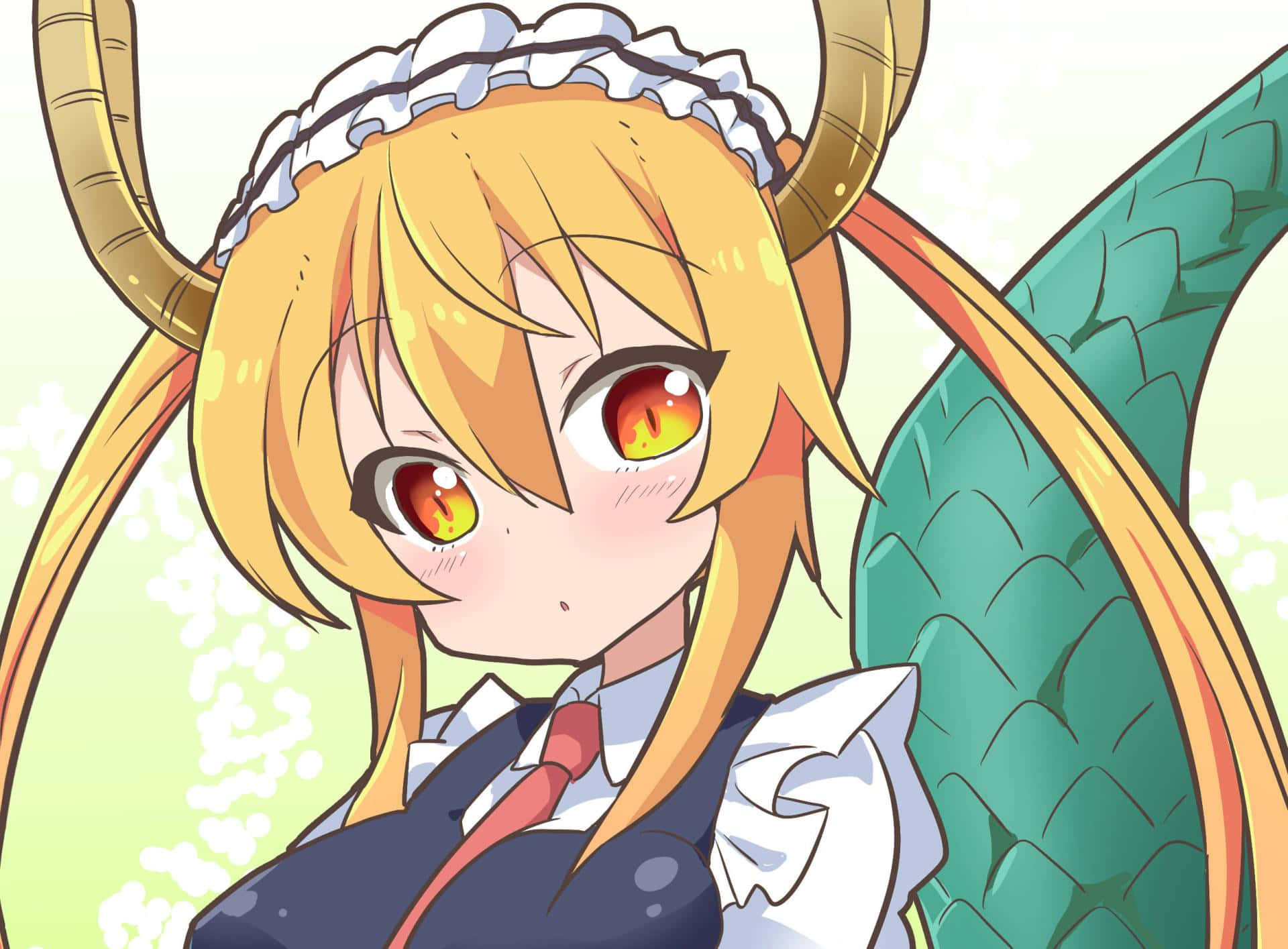 A Girl With Long Hair And Horns Is Holding A Green Dragon Wallpaper