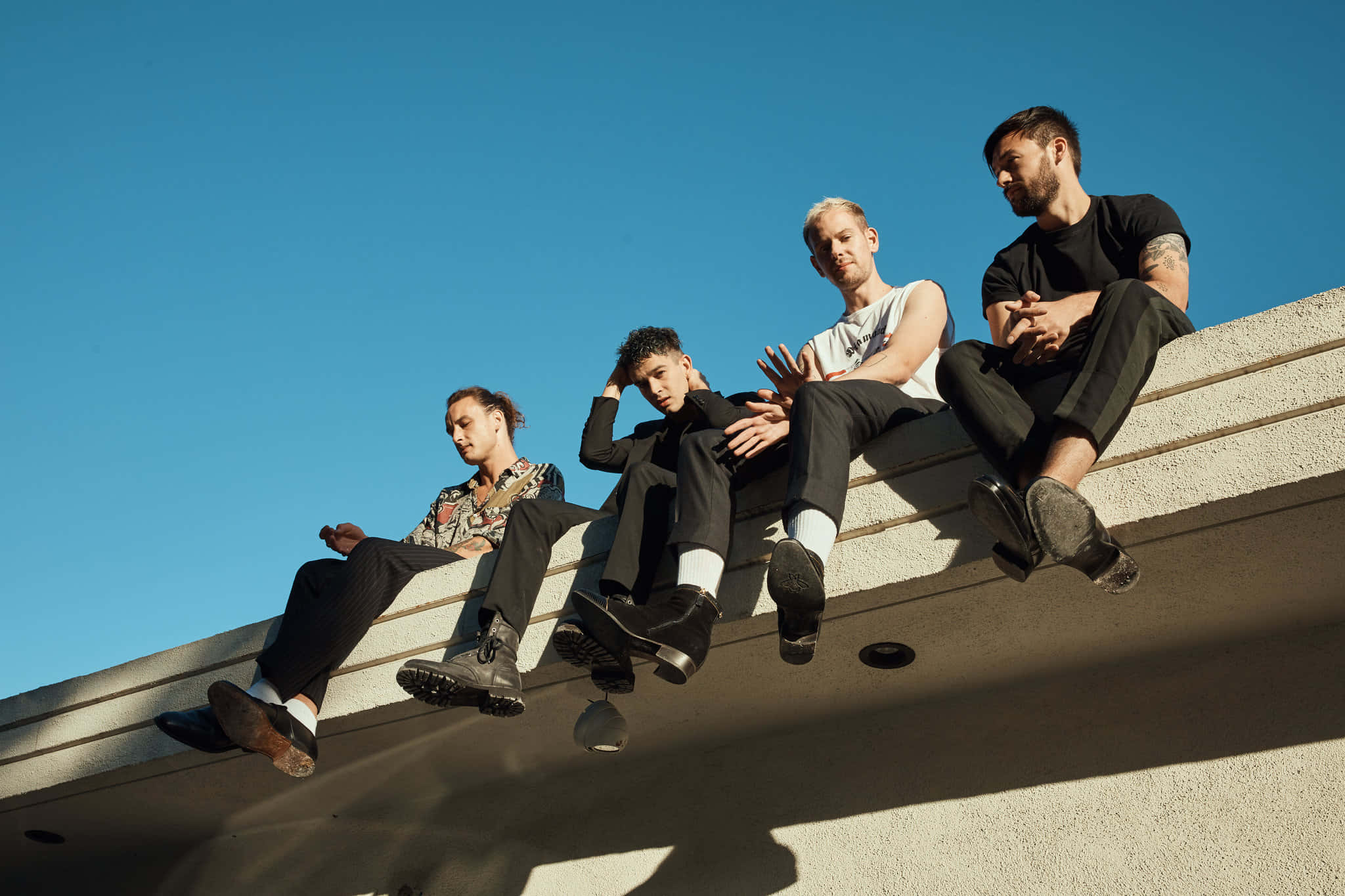 A Group Of Men Sitting On A Ledge Wallpaper