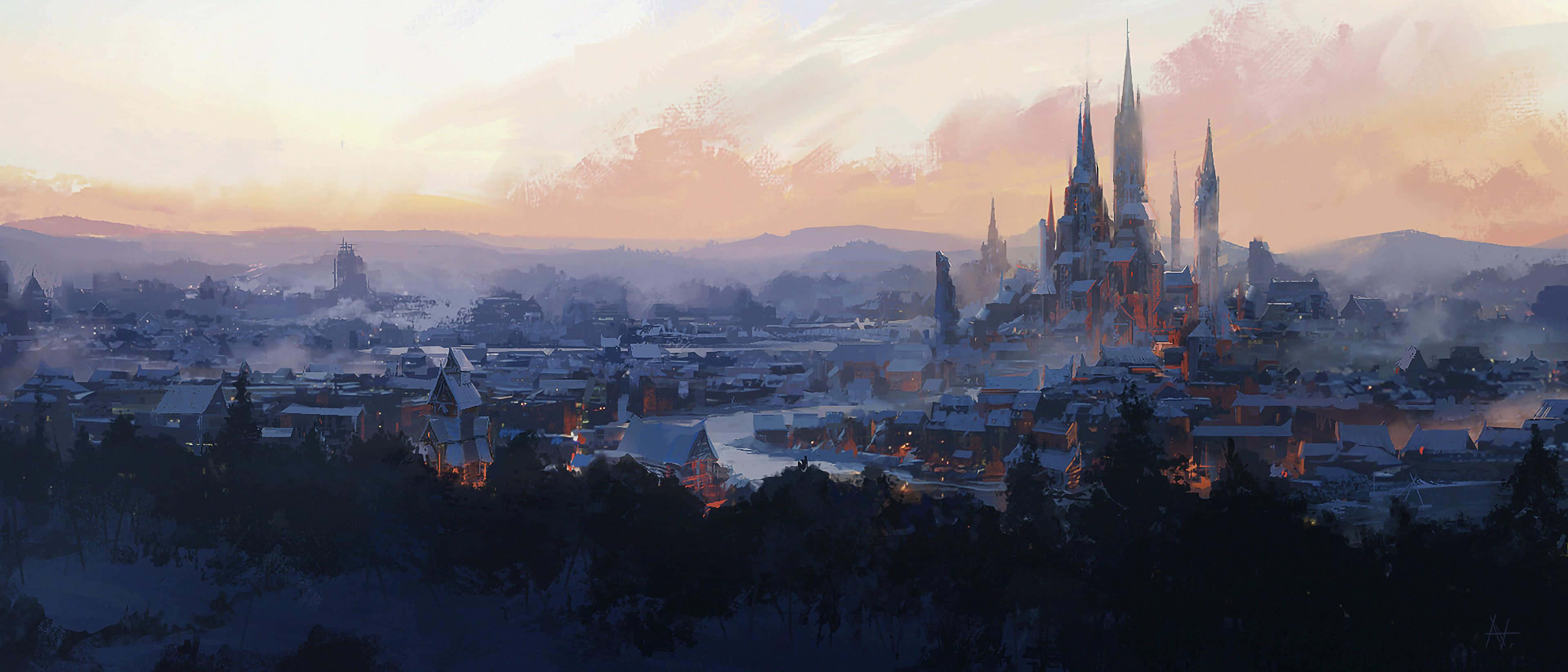 Related A Painting Of A City At Sunset Wallpaper