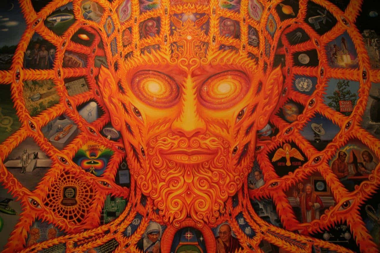 A Painting Of A Man With A Large Head And Many Symbols Wallpaper