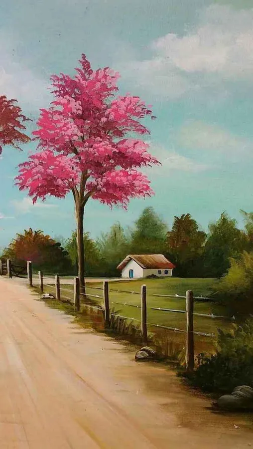 Related A Painting Of A Road With Trees And A Fence Wallpaper