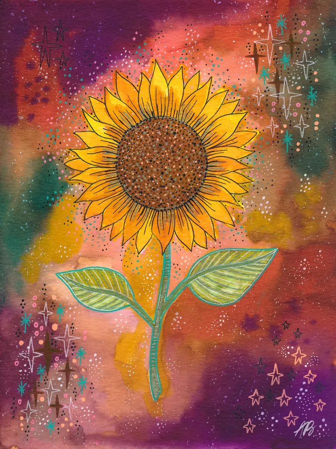 A Painting Of A Sunflower With Stars On It -