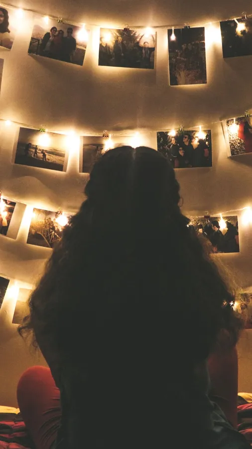 Related A Person Sitting On A Bed With Pictures Hanging On The Wall Wallpaper