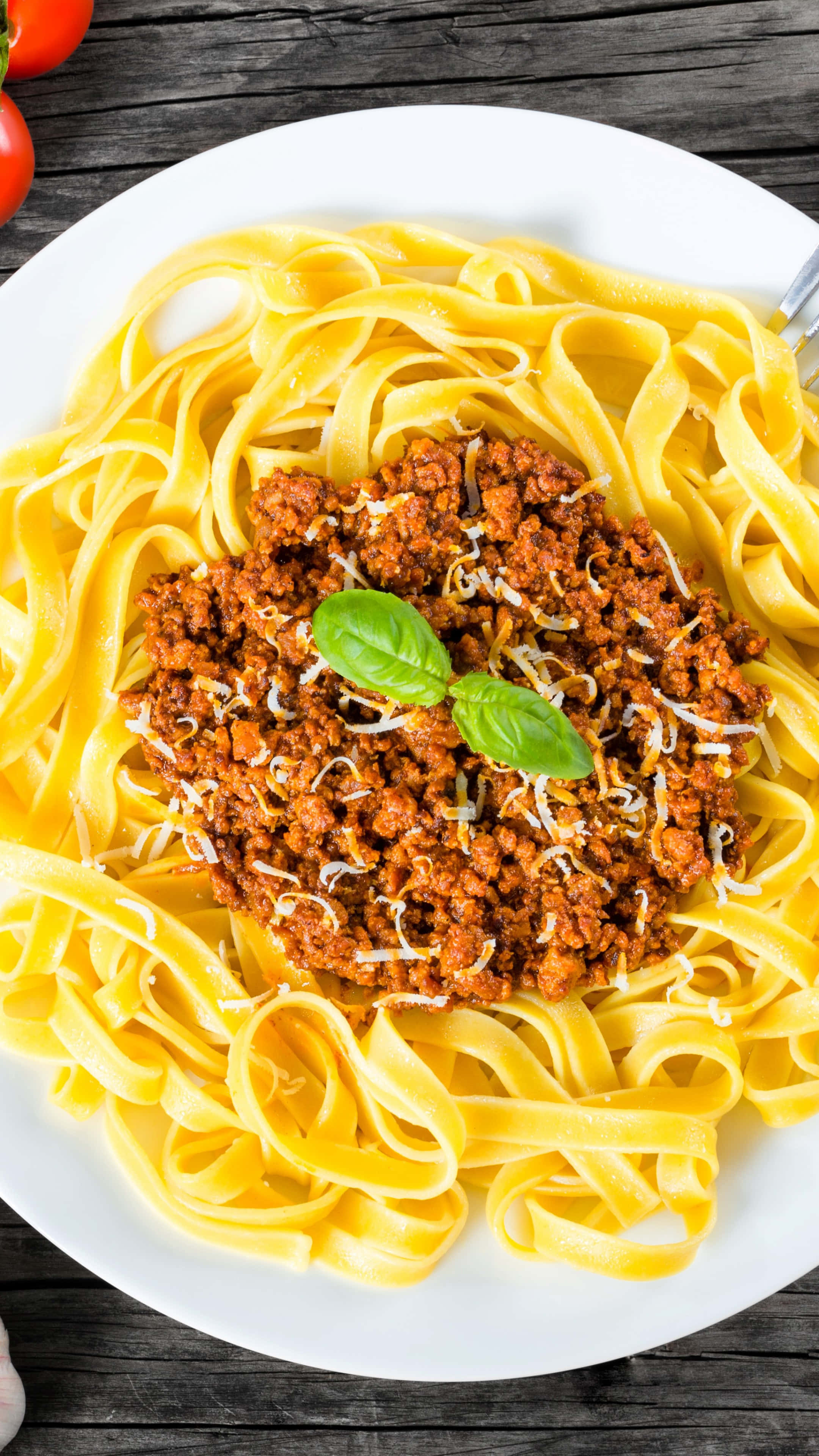 A Plate Of Pasta With Meat Sauce And Tomatoes -
