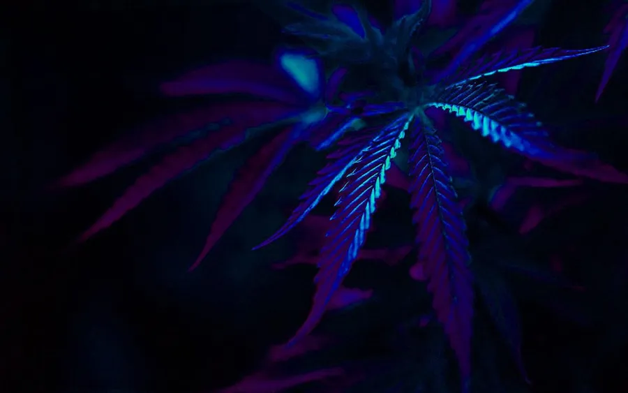 A Purple Marijuana Leaf Is Lit Up In The Dark -