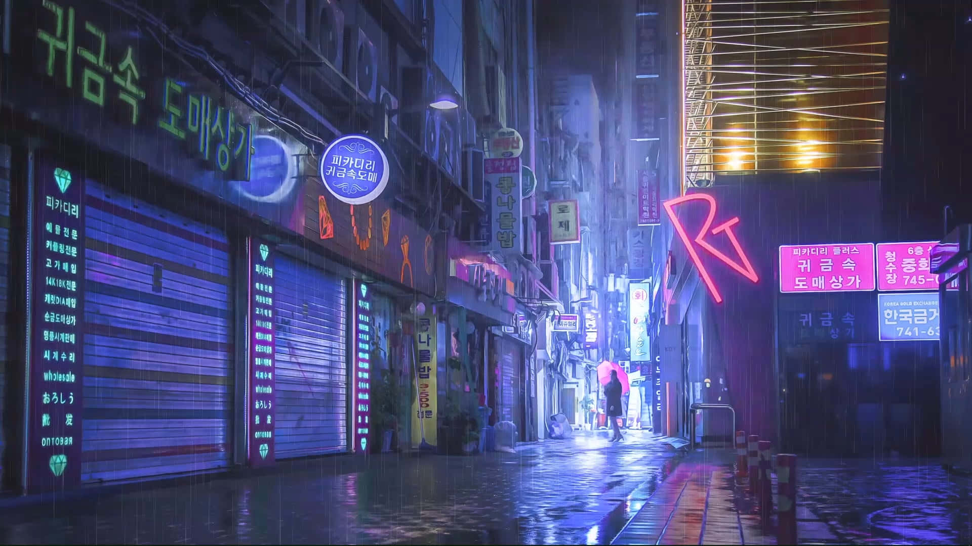 A Rainy Night Scene With A Neon Sign And Umbrella Wallpaper -