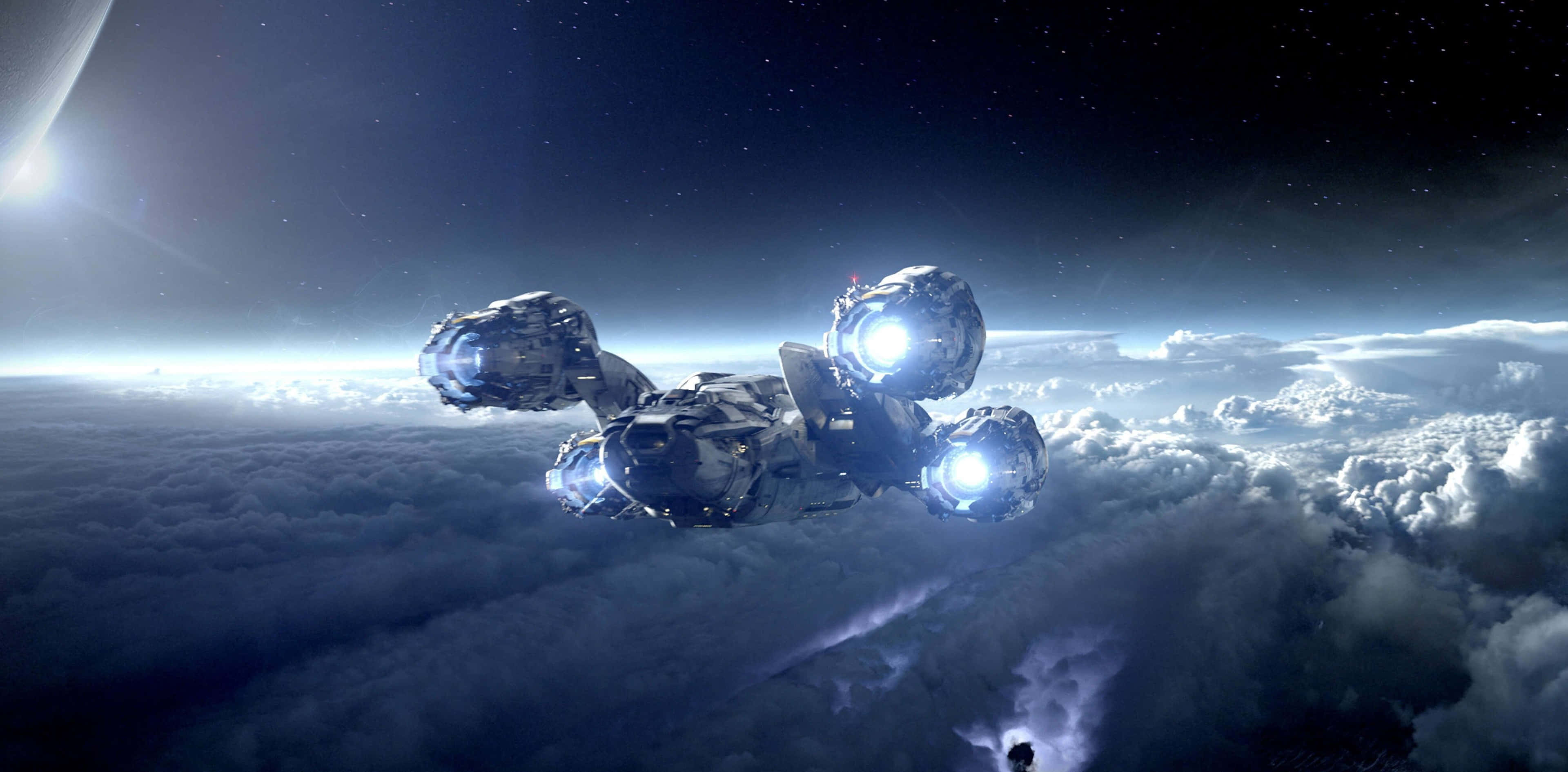 A Spaceship Flying Over The Clouds Wallpaper -