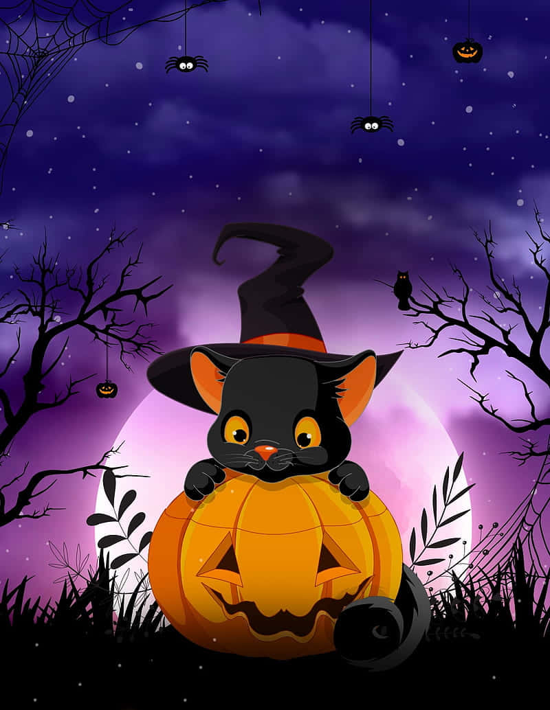 A Mysterious Halloween Cat Wearing A Witch's Hat Wallpaper -