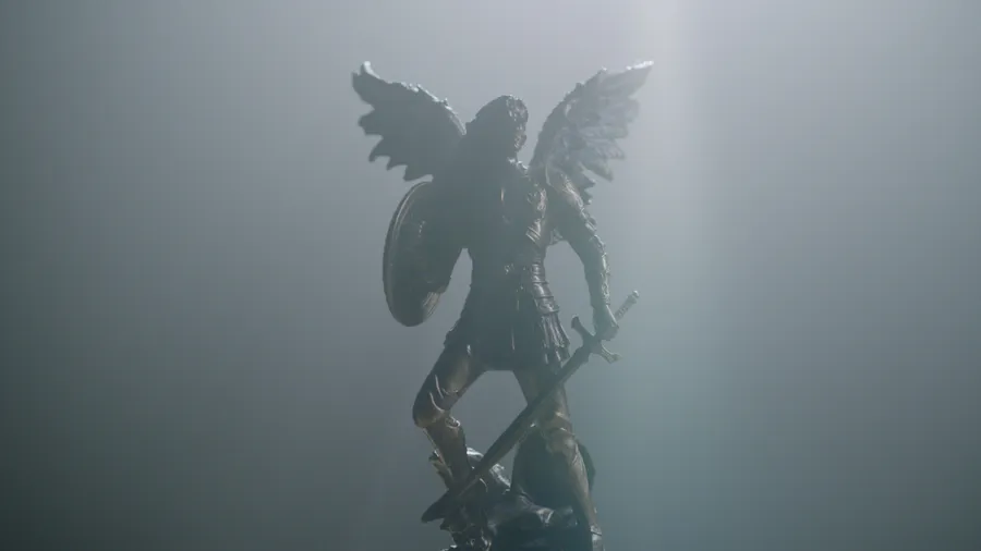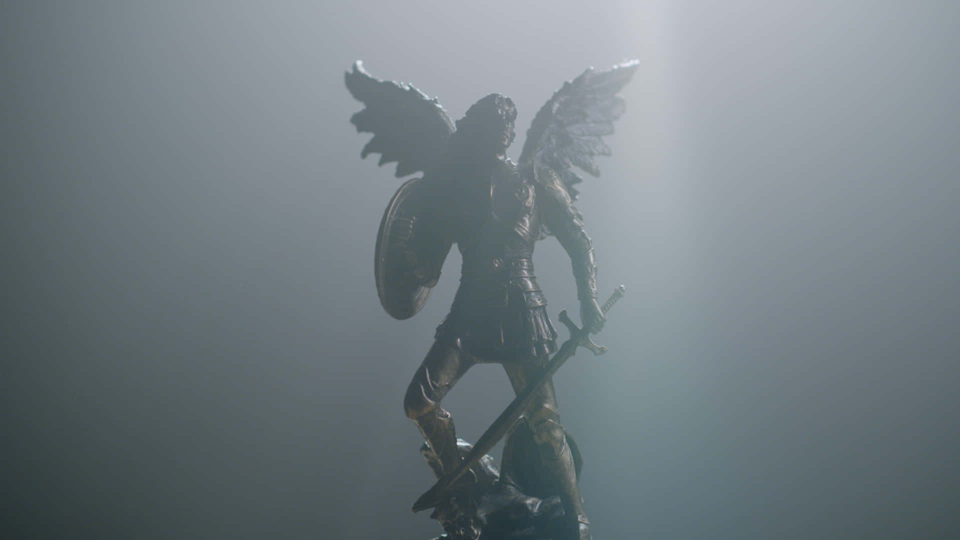 A Statue Of An Angel With A Shield In The Light Wallpaper