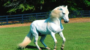 A Woman Is Standing On The Beach With A White Horse Wallpaper