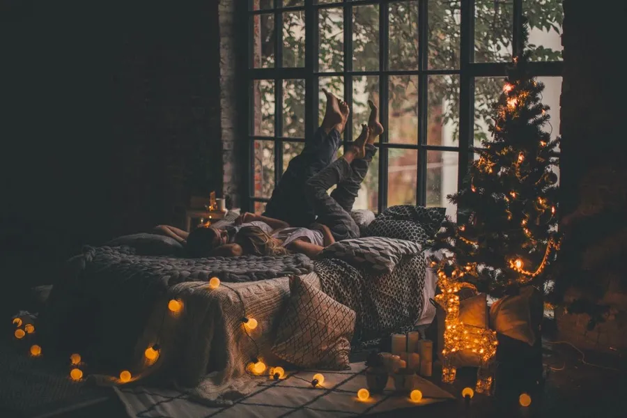 Related A Woman Laying On A Bed With Christmas Lights Wallpaper
