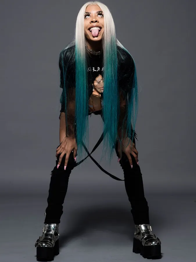A Woman With Blue Hair Posing For A Photo Wallpaper