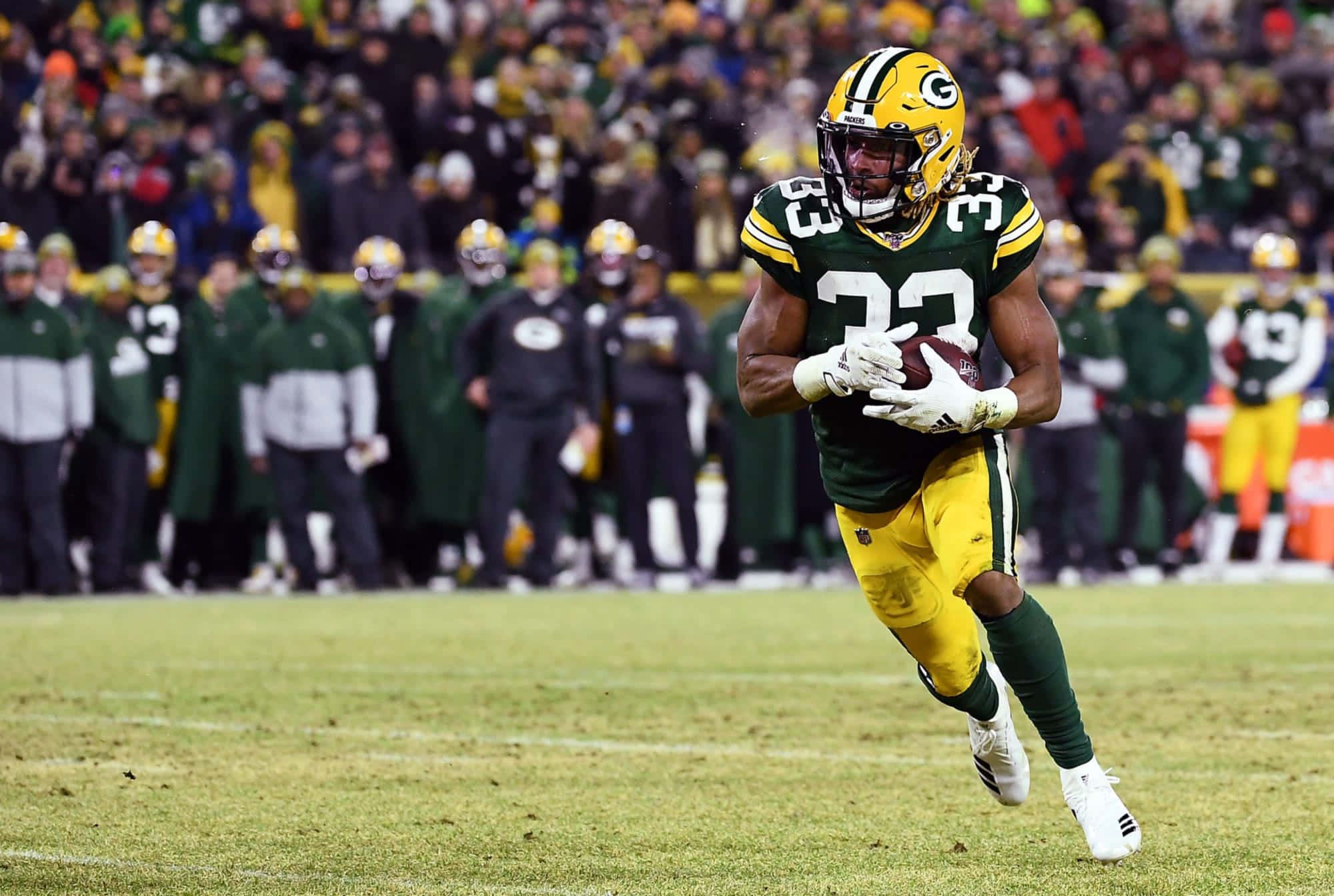 Green Bay Packers Aaron Jones Running The Ball In A Home Game. Wallpaper -