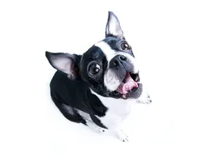 A Boston Terrier Joyfully Looking Up At The Camera Wallpaper -