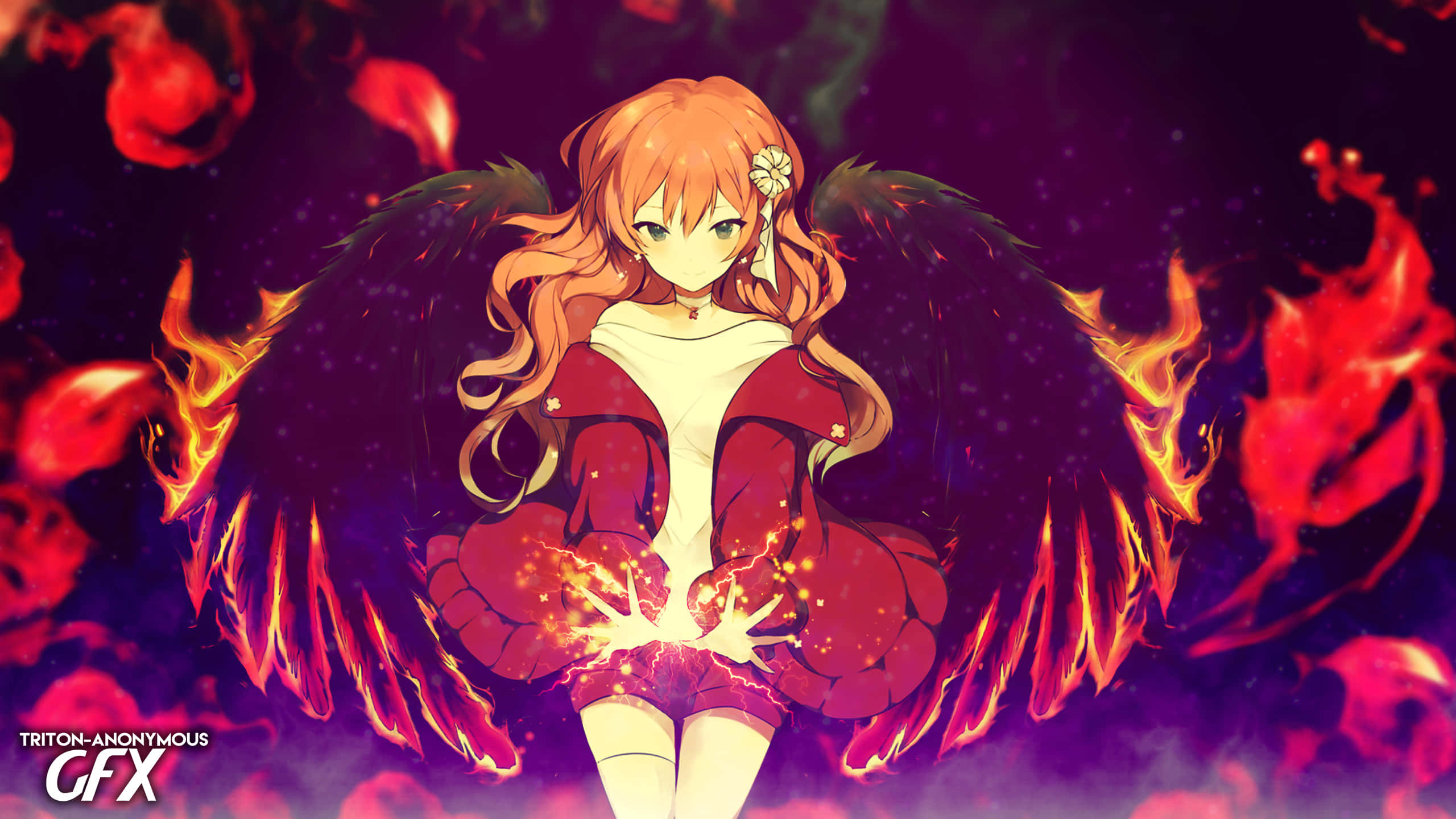 Anime Floating Girl Wings On Fire Wallpaper -