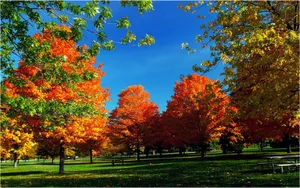An Autumnal Wonderland Of Vibrant Hues, Glimmering Amongst Lush Green Trees Wallpaper -