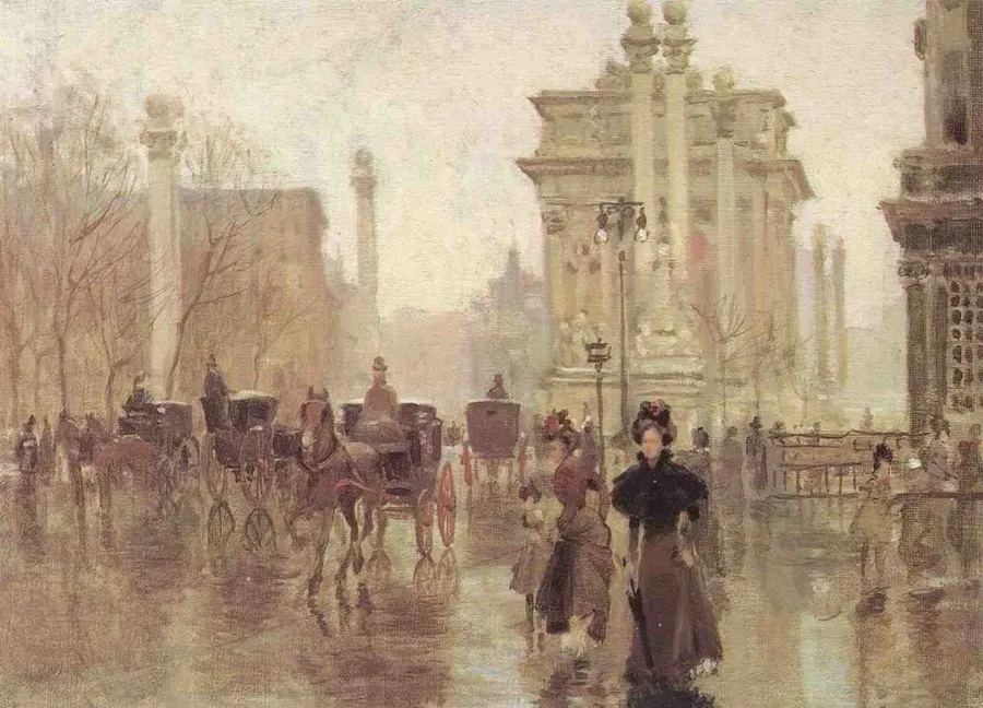 A Painting Of A Scene With People In The Middle Of A City Wallpaper -