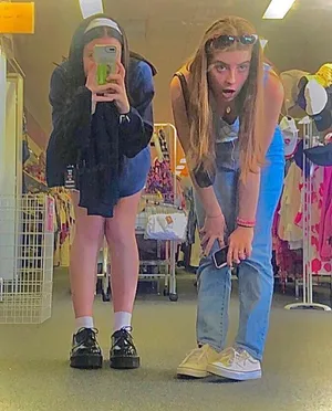 Two Women In A Parking Lot Jumping In The Air Wallpaper -