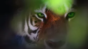 Tiger With Green Eyes In Bush Wallpaper -