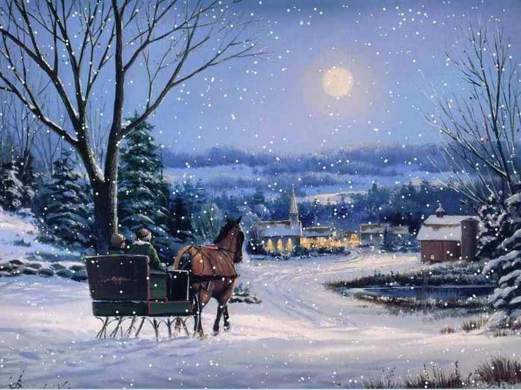 A Painting Of A Woman Walking With A Sleigh In The Snow Wallpaper -