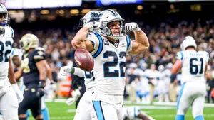 Carolina Panthers Running Back Christian Mccaffrey Rushes For A Touchdown During An Nfl Game. Wallpaper -