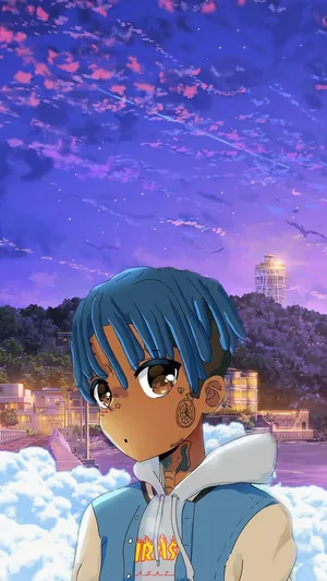 A Cartoon Character With Blue Hair And Tattoos In A Neon City Wallpaper -