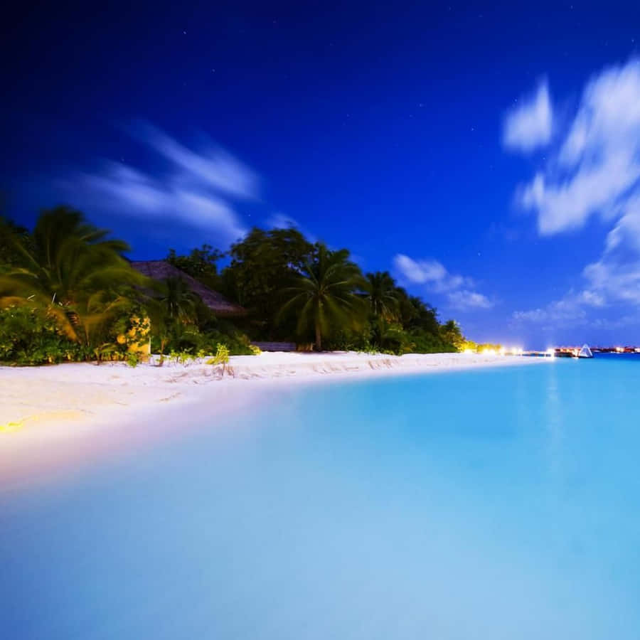 A Tropical Island With Thatched Huts And A Sunset Wallpaper -