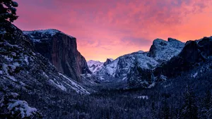 A Mountain Range With A Pink Sky And Snow Wallpaper -