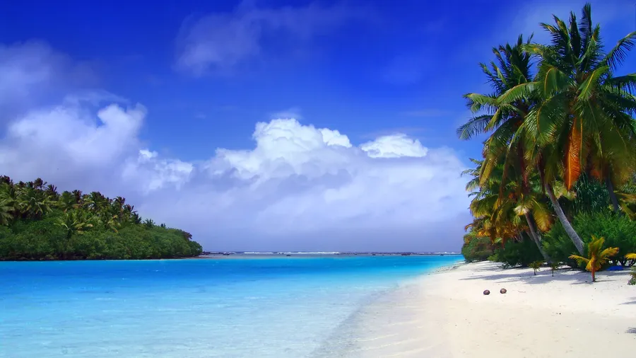 A Beach With Palm Trees And Clear Water Wallpaper -