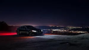 A Stylish Black Bmw Parked In Front Of City Lights Wallpaper -