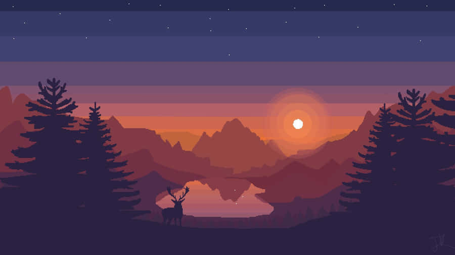 A Picturesque Sunset Sets The Stage For This Stunning Pixel Landscape. Wallpaper -