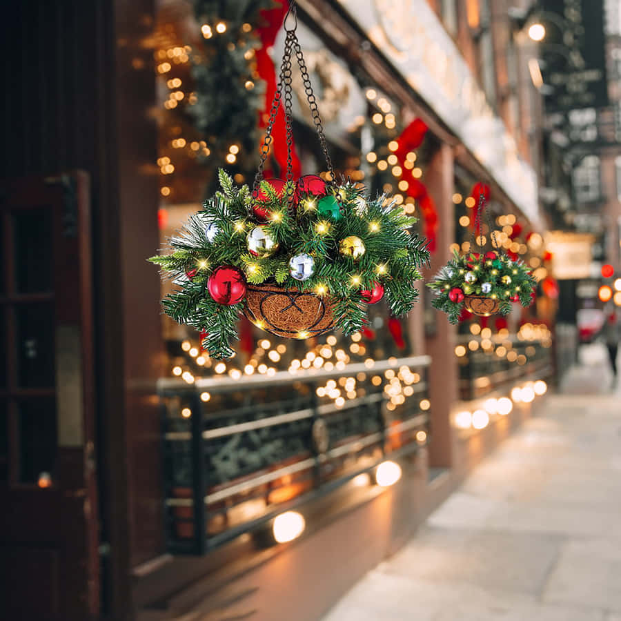 Take A Stroll Under The Enchanting Glow Of These Christmas Lights. Wallpaper -
