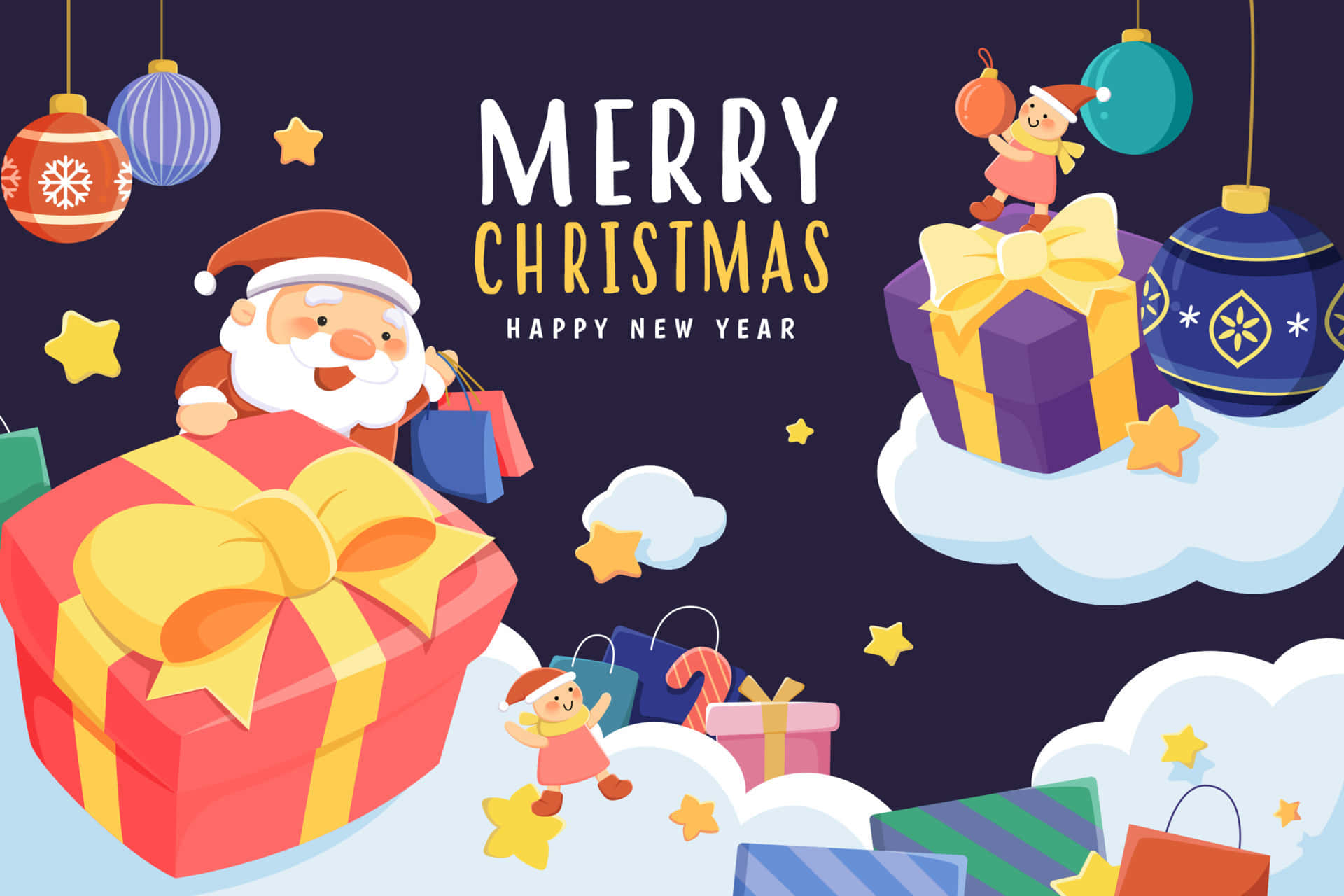 Greeting Card With Christmas Elves, Santa, And Gifts Wallpaper