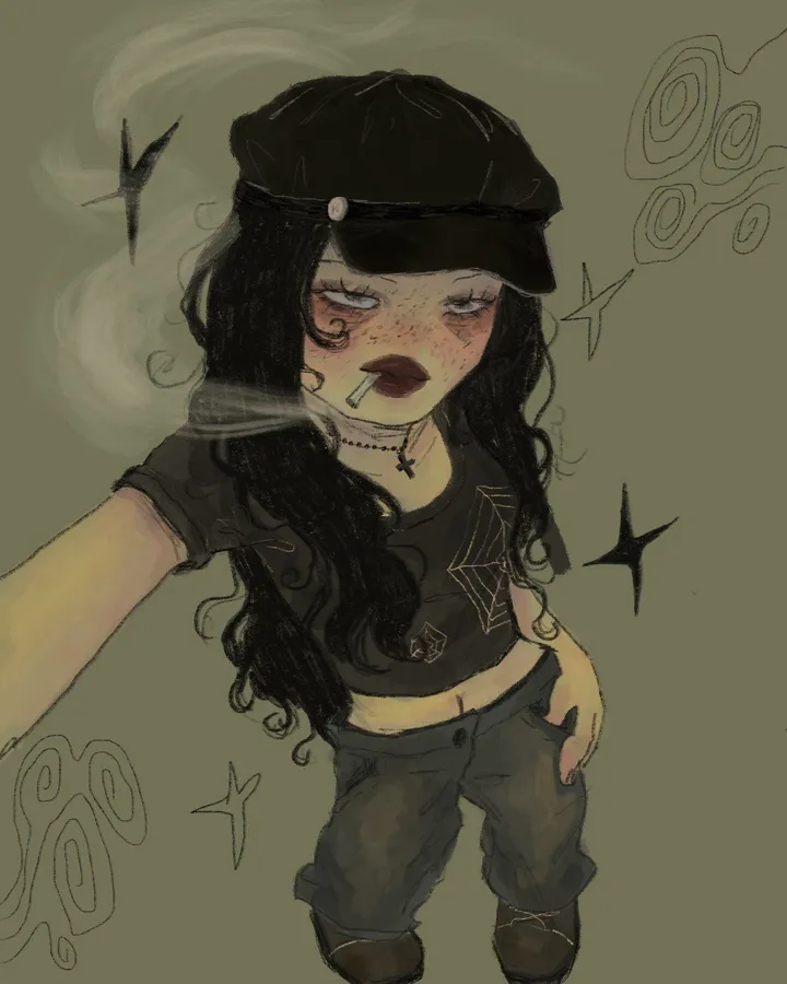 Grunge Cartoon Black Hair Girl Smoking Wallpaper