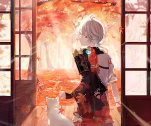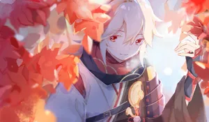 Happy Genshin Impact Kazuha Holding A Leave Wallpaper