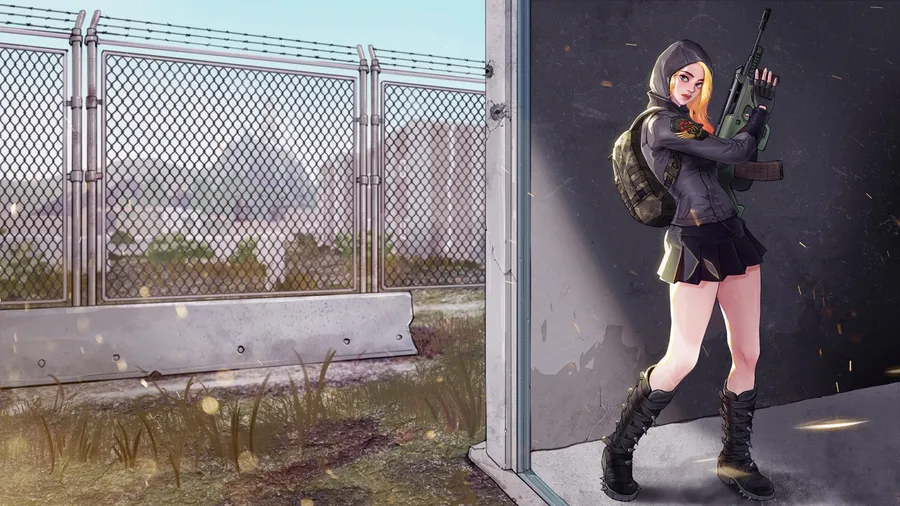 A Woman In A Red And White Outfit Holding A Rifle Wallpaper -