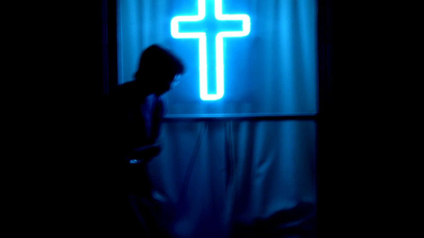 Caption: Illuminated Neon Cross Against A Dark Background Wallpaper -